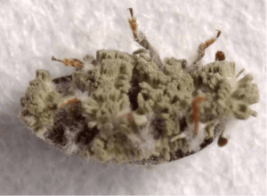 Carreck et al. (2007) show in a later study that M. anisopliae, disseminated to the flowering canopy of oilseed rape by honey bees, infect seed weevil adults and pollen beetle adults and larvae in the flowers.  Subsequent mortality of adults of both species and the larvae of pollen beetle, following incubation in the laboratory was high, and always exceeded 70%. A high proportion of cadavers showed external conidiation, confirming infection by M. anisopliae.